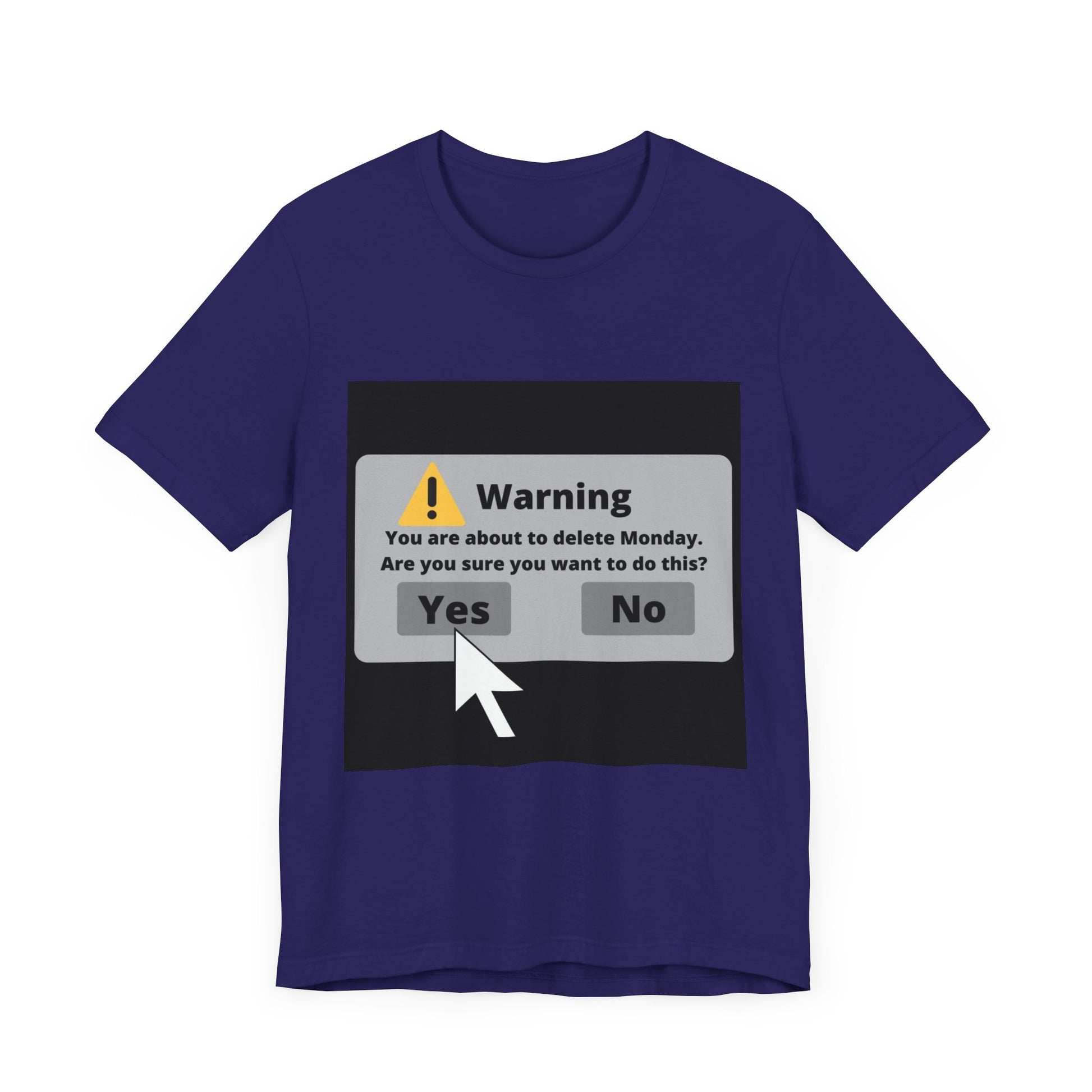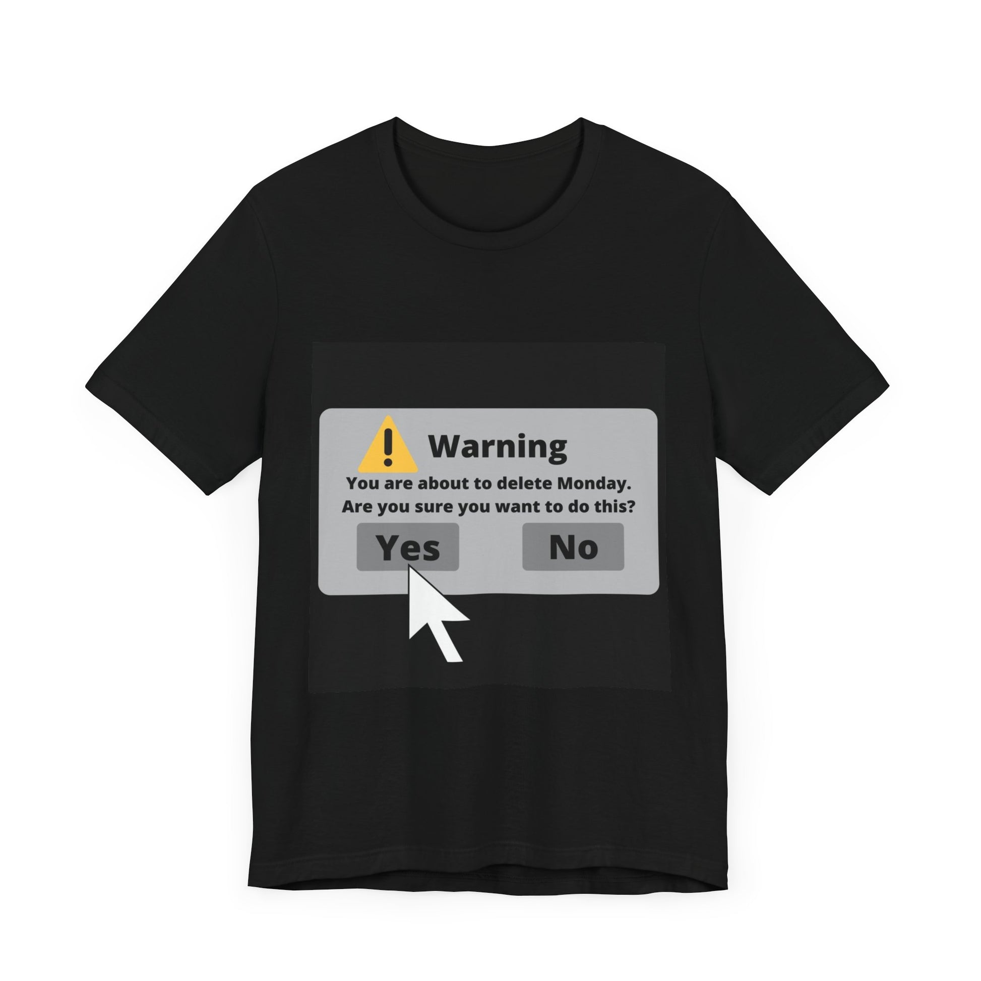 This humorous t-shirt shows a mock warning dialog box asking if the user wants to delete Monday. The dialog box has a yellow triangular warning icon and text that reads "Warning: You are about to delete Monday. Are you sure you want to do this?" Below are "Yes" and "No" buttons, with a mouse cursor hovering over the "Yes" option. This shirt is a great funny holiday gift for a friend or family member!