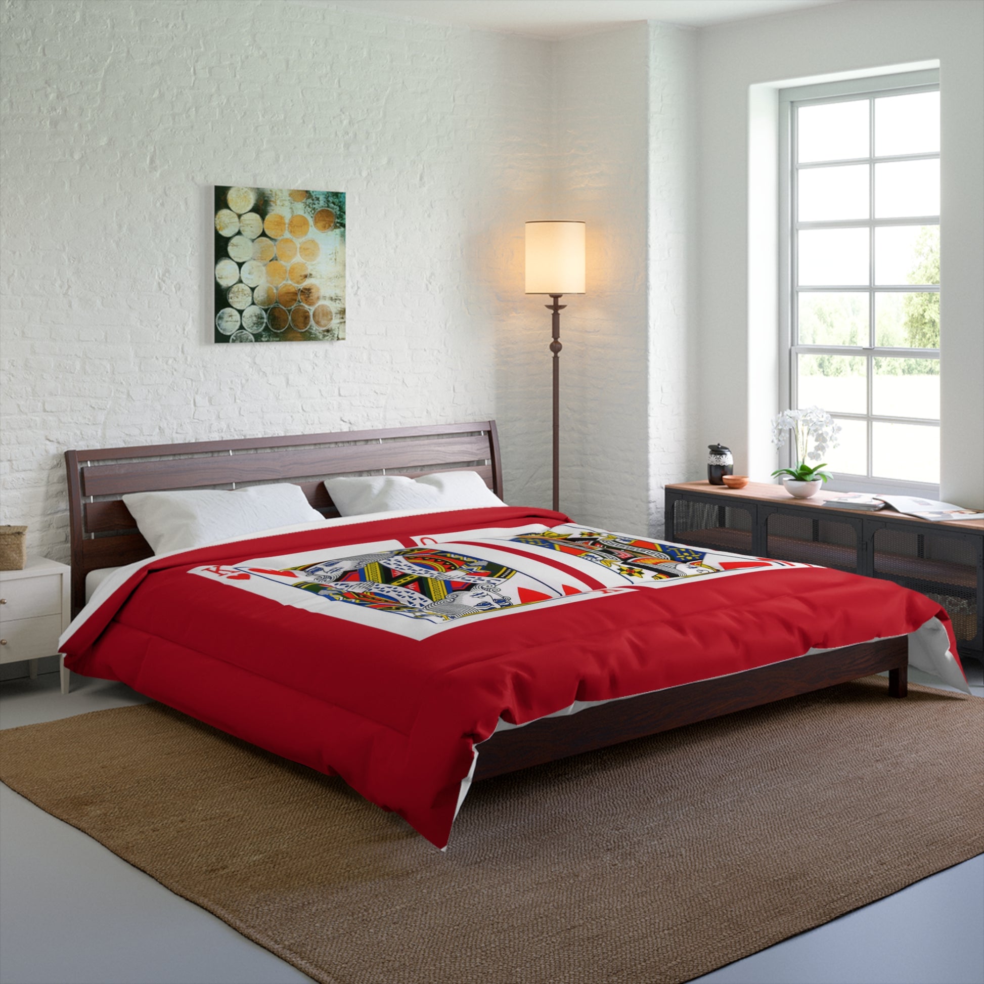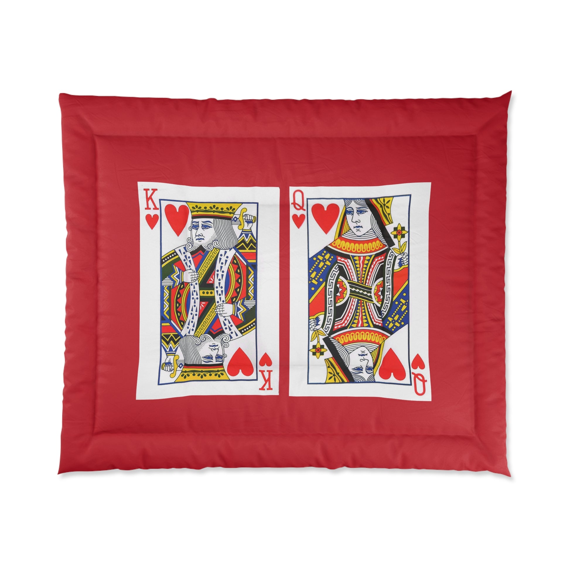 This King and Queen of Hearts Playing Cards Comforter features a red background and is perfect for adding a touch of whimsy and romance to your bedroom decor. The vibrant colors and unique design create a cozy and inviting atmosphere, making it a great addition to your home during Valentine's Day or any time you want to feel like royalty. The lightweight material and soft polyester blend ensure a comfortable night's sleep.